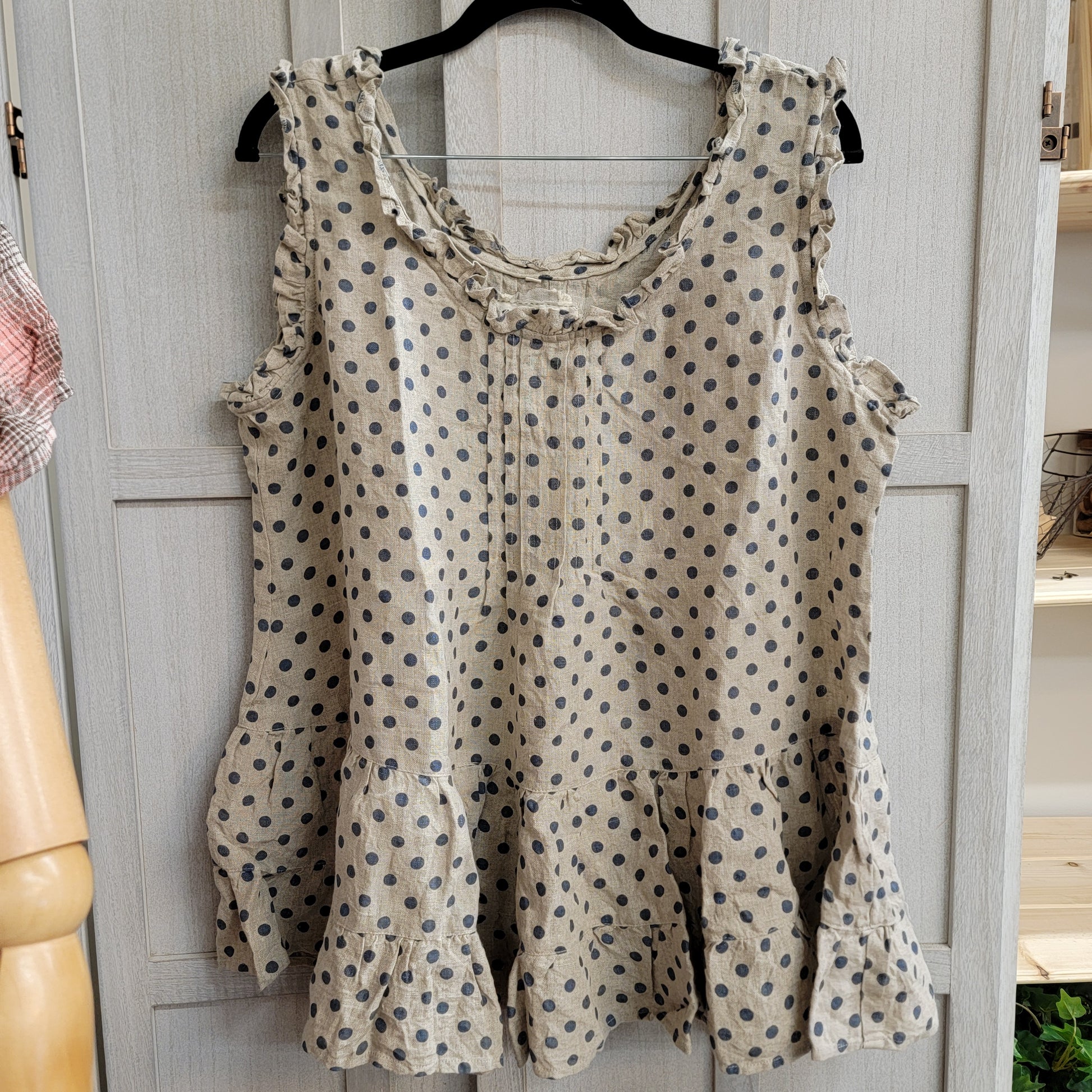Sweet, Cami Top in a Natural Linen an Blue Polka, with small ruffled sleeve & neck