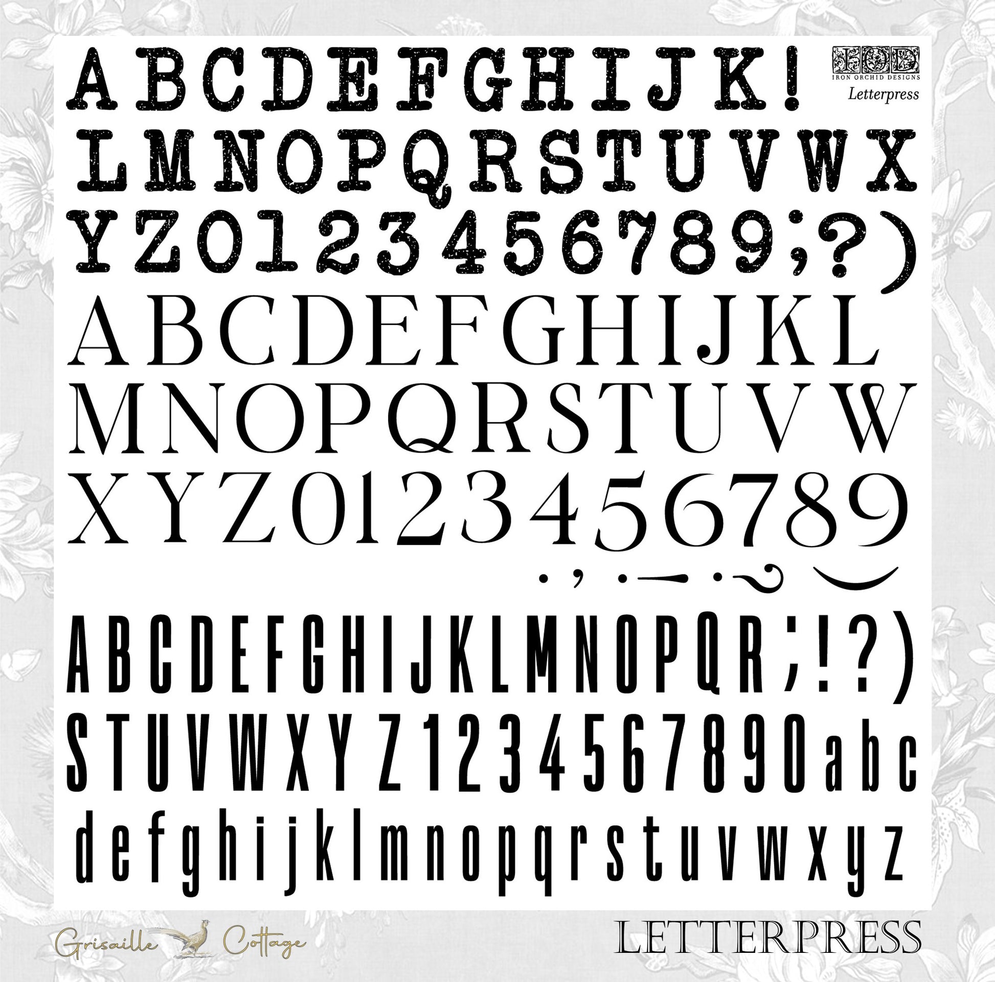 IOD Stamp - 12x12 with multiple individual clear stamps, 3 Letter & Numbers Styles, Appx 1in tall