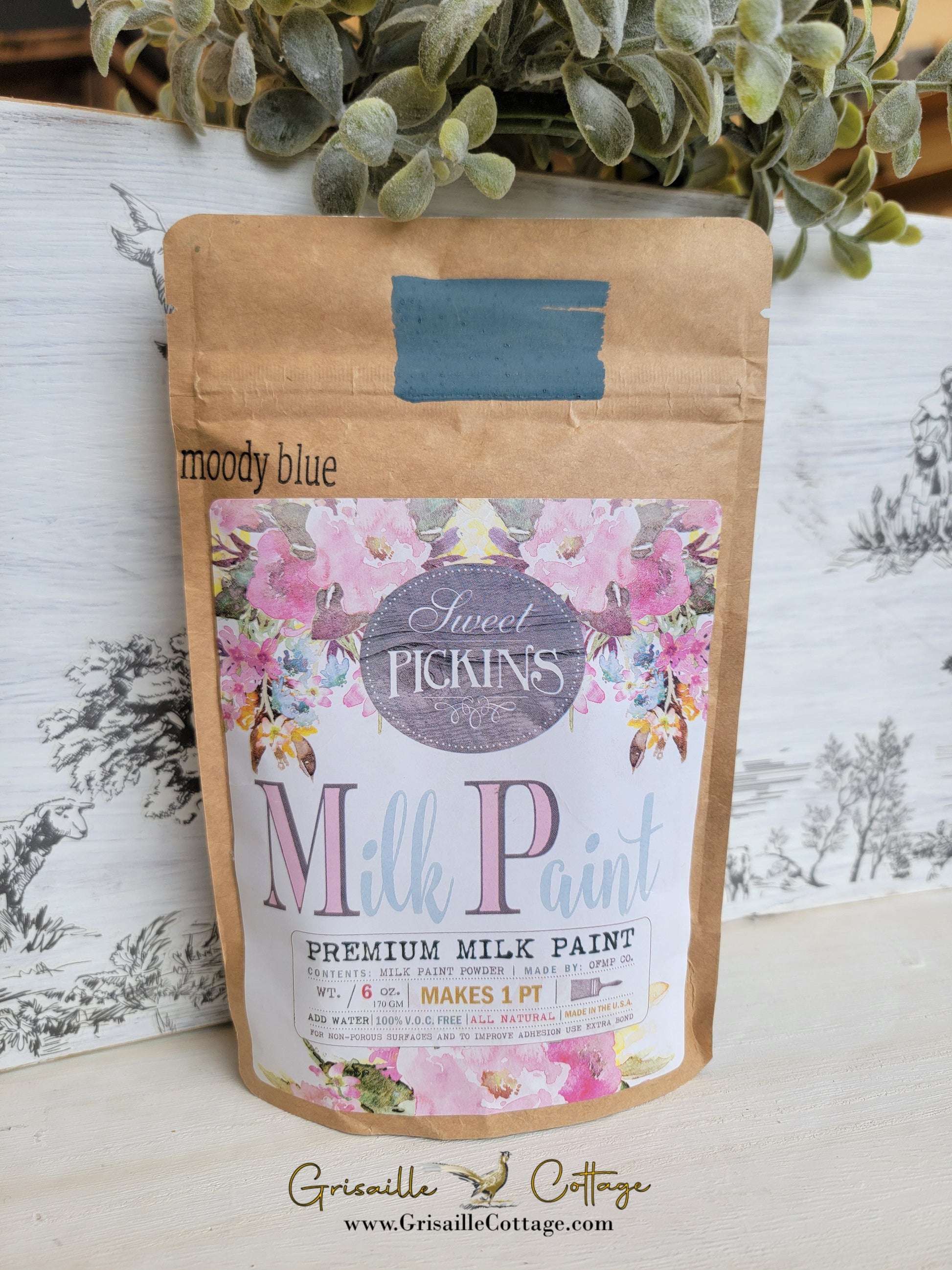 Sweet Pickins Milk Paint is a true milk paint which comes in a powder form. Our Milk Paint is environmentally safe, non-toxic and is food safe. There is a slight milky odor when it is applied, but it is completely odorless when dry. Our milk paint is 100% VOC free and is made with all natural earth materials.