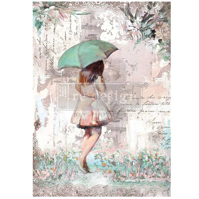 Come tiptoe through the puddles with us on this gorgeous new Fiber Paper design named, “Rainy Afternoon”! With soft pastels, wondrous layers, touches of lace, a smattering of watercolor florals, and the aqua coordinating umbrella, our rainy day gal will look beautiful on a dresser, bureau, canvas, and more! Never used our Decoupage Fiber Paper before? Do not worry! A high-quality material built on flexibility, ease of use and durability, our new Decoupage Fiber will surely give you incredible results and applications. Made of a high density, fibrous material, Decoupage Fiber is designed to be used on any surface, from furniture to walls, with a wrinkle-free surface that will provide incredible results. This tear-resistant, non-wrinkling, and ultra versatile material is compatible with most water-based mediums, and will completely blend into your surfaces without any cracking or warping. A budget-friendly option, Decoupage Fiber provides a beautiful and economical way to transform your surfaces and pieces, easily and affordably. Best paired with: Decoupage Gel, Mod Podge, other water-based sealants. Best used on: almost any surface including wood, canvas, concrete, plastic, glass, plaster, etc. 1 sheet, A1 sized