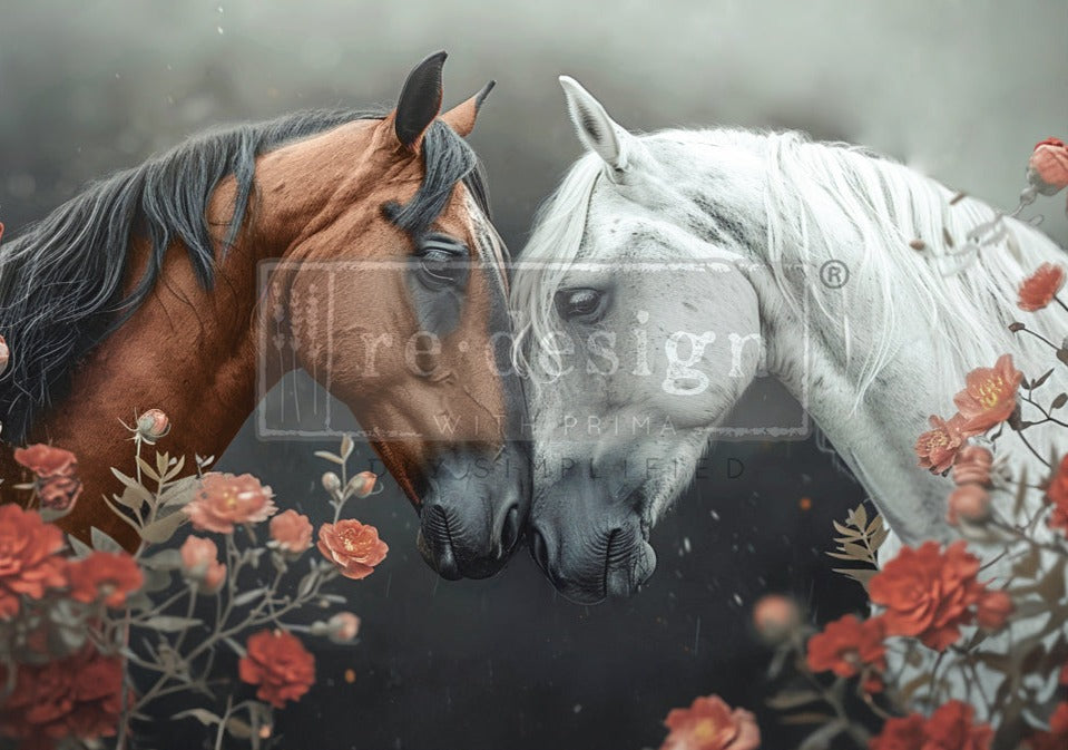 Wild Hearts,” captures the spirit of untamed beauty with its stunning portrayal of two horses sharing a moment amidst a bed of blooming flowers. Each horse is depicted with lifelike detail, from the curve of their powerful muscles to the gentle arch of their necks, imbuing the scene with a sense of grace and strength.